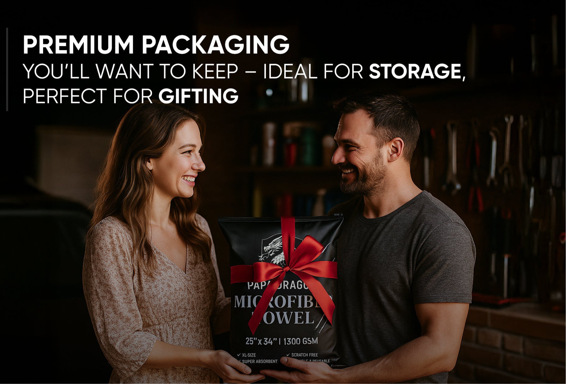 More surface aria, more absorption. Crafted from premium 1300 GSM ultra-soft microfiber Papa Dragon Drying Towel ensures unmatched absorptions, streak free finish.